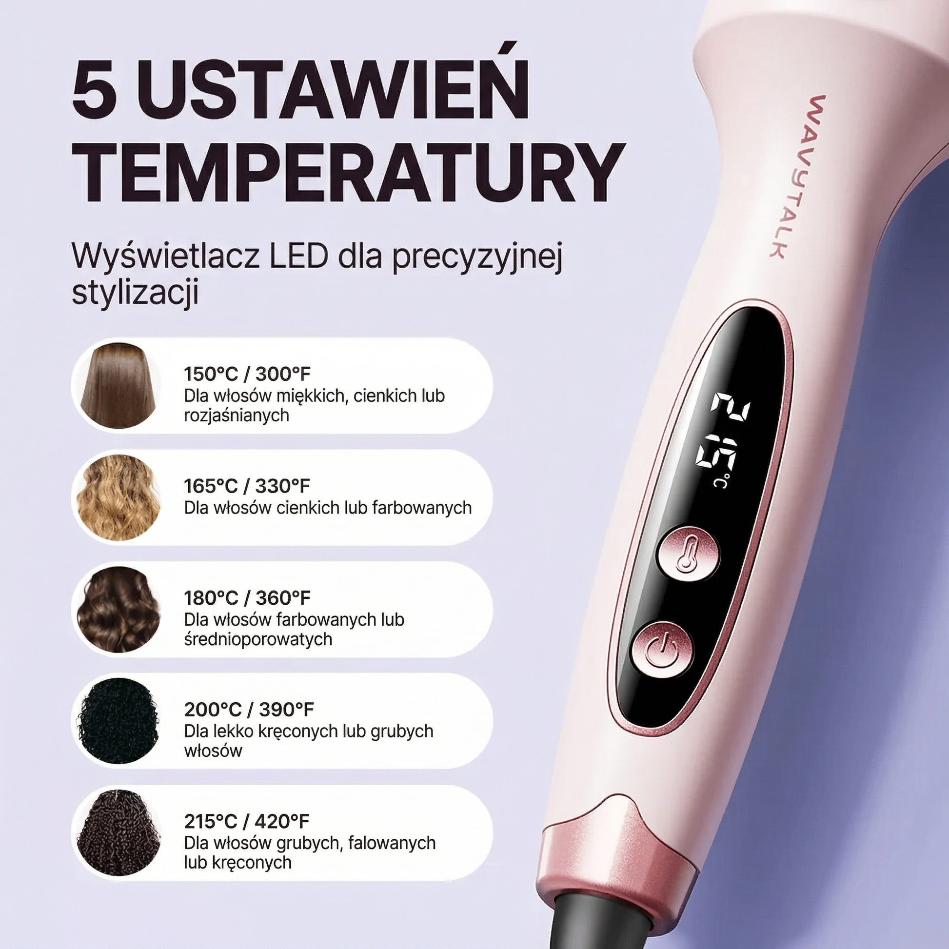 • 5 ustawień temperatury (150–165–180–200–215°C)
