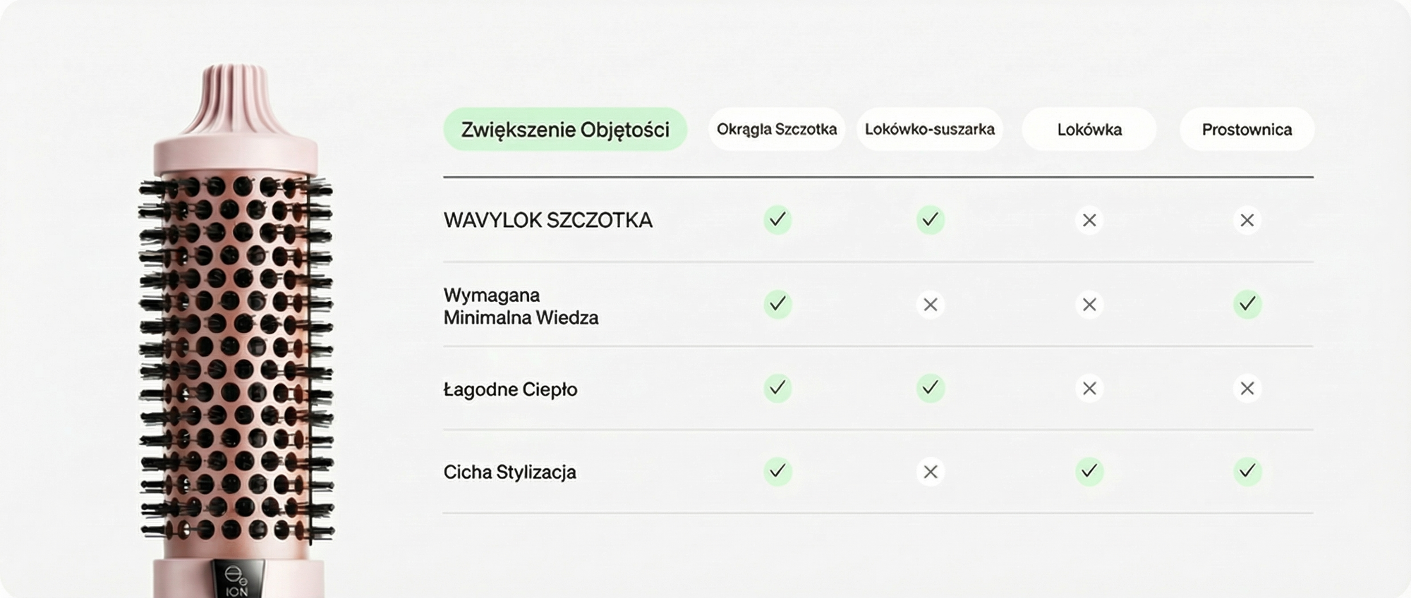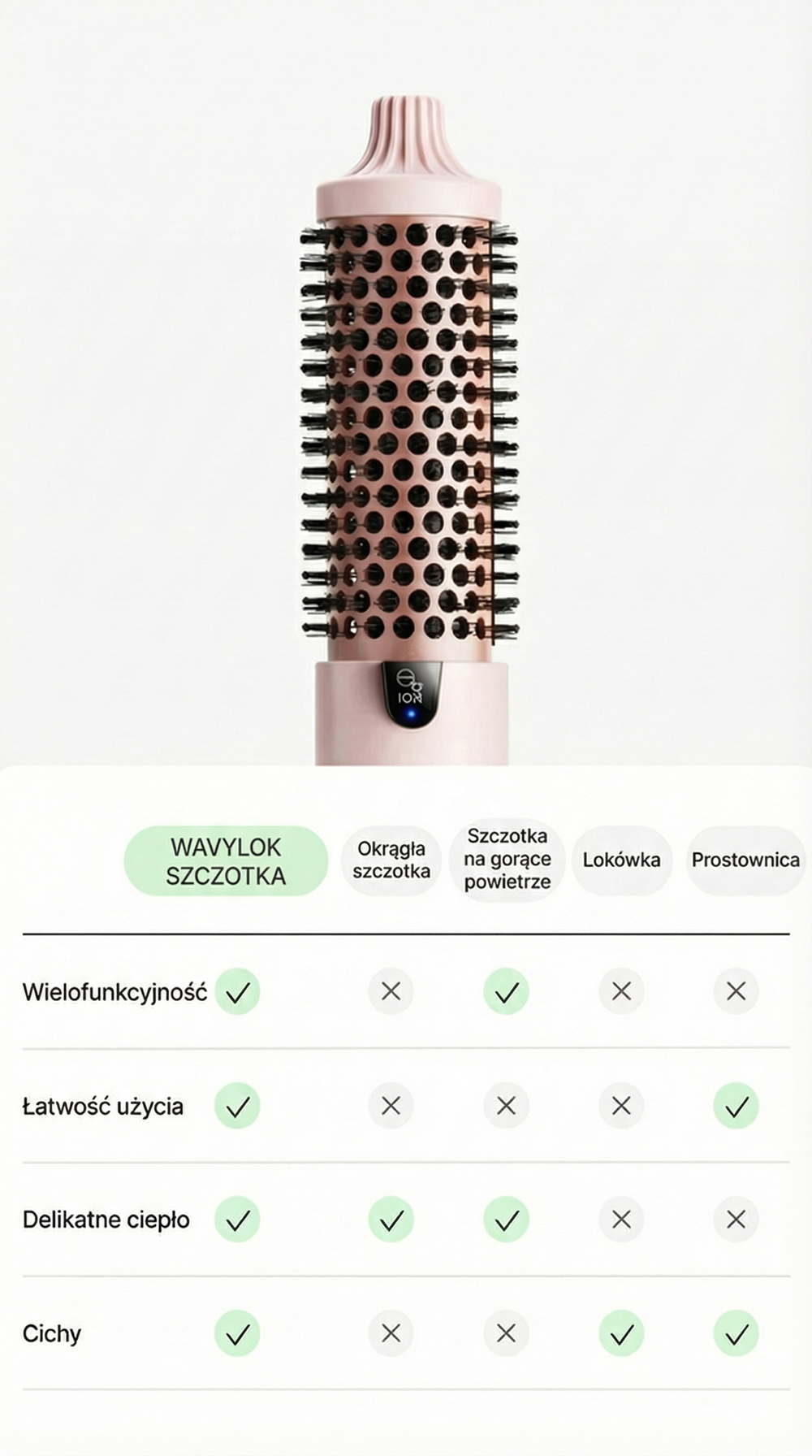 Ta szczotka nie suszy włosów powietrzem. Służy do stylizacji na sucho i wykorzystuje technologię jonową oraz nagrzewaną powierzchnię, aby nadać włosom gładkość i objętość — efekt jak po wyjściu od fryzjera.
